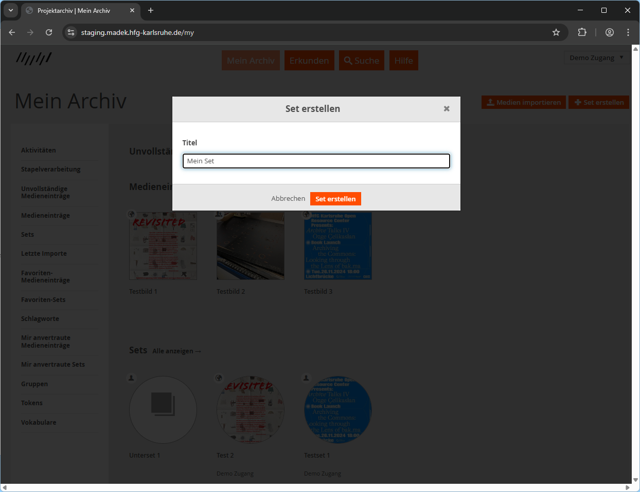 To make your media entries visible to others, click on “Sets” in the menu column on the left, then click on your project set. Check whether all media entries are included.