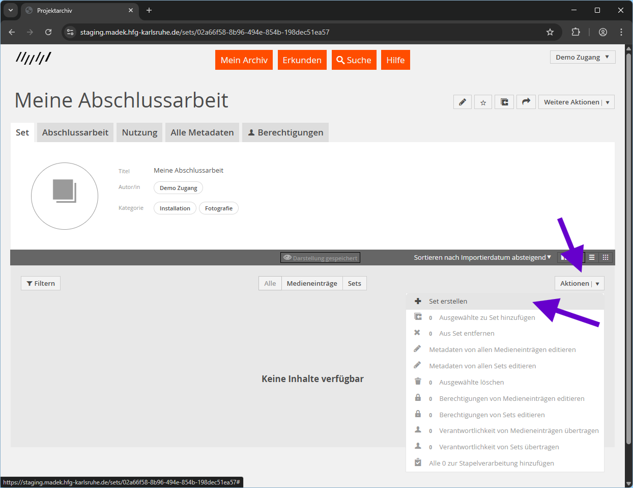 To make your media entries visible to others, click on “Sets” in the menu column on the left, then click on your project set. Check whether all media entries are included in addition to the subsets.