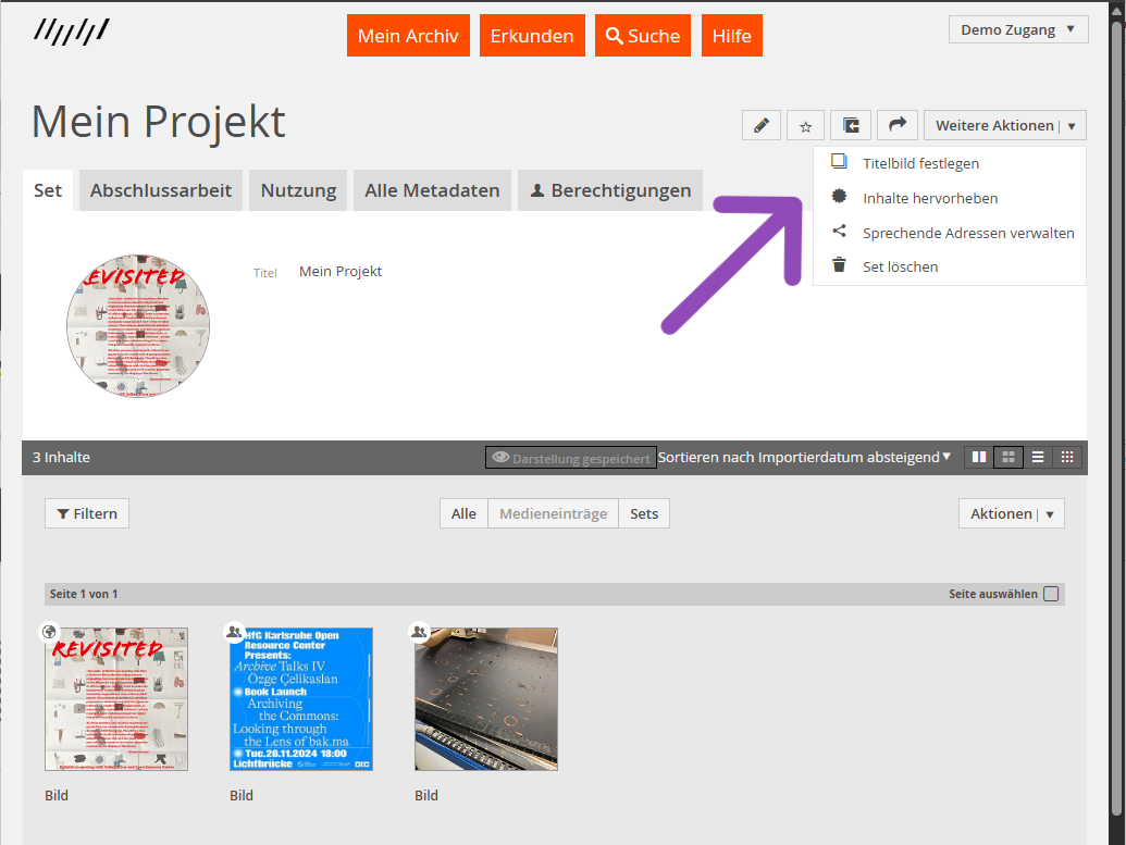 If you have added the media entries to your project set and open your project set, you can use the “More actions” button to define the cover image of the project set and highlight particularly important entries.